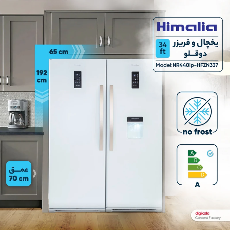 یخچال و فریزر دوقلو هیمالیا مدل NR440ip-HFZN337 از تولیدات برند هیمالیا و مجهز به آبسردکن نیمه اتوماتیک و یخساز اتوماتیک است. کنترل الکترونیکی هوشمند مجهز به سیستم عیبیاب از قابلیتهای مهم آن به شمار میرود. یخچال این محصول دارای محفظههای نگهداری میوه و سبزیجات همراه با کنترل رطوبت (Moisture Balance) است که به همین دلیل مواد غذایی و اقلام خوراکی قرار گرفته در این محفظهها مدت زمان طولانیتری باطراوت و تازه میمانند. LED داخلی و نمایشگر لمسی از دیگر ویژگیهای یخچال و فریزر هیمالیا مدل آیس پول هستند. شرکت سازنده هنگام تولید این محصول آن را به فیلتر آب مجهز کرده است بنابراین از تهیهی آب تصفیه شده برای آشامیدن بینیاز خواهید بود. یخچال این محصول دارای 5 طبقه و 2 کشو و فریزر آن دارای 8 کشو است که همین موضوع گنجایش بالایی برای قرار دادن مواد غذایی و اقلام مختلف را در اختیار شما قرار خواهد داد.