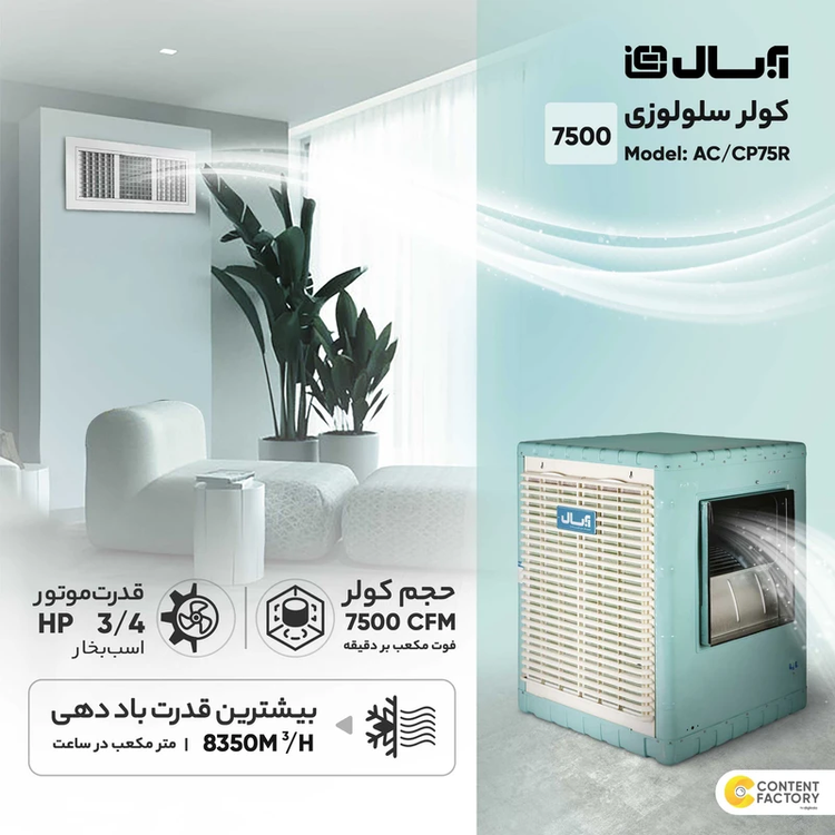 ۷۵۰۰ CFM(فوت مکعب بر دقیقه) مناسب برای متراژ بیش از ۱۲۰ متر مربع (کولرهای با حجم ۷۰۰۰ به بالا) (متناسب با شرایط محیط)